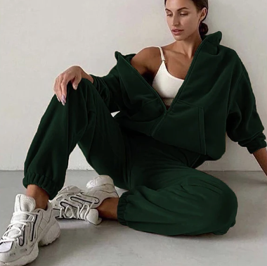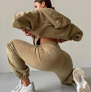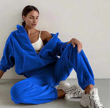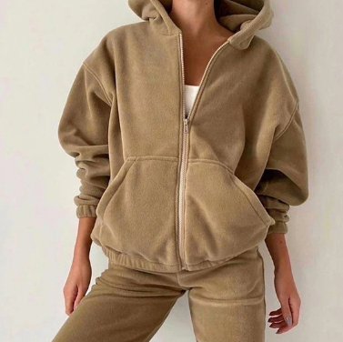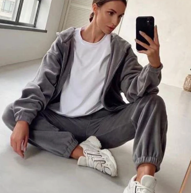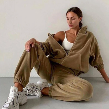 Ten welurowy komplet dresowy z kapturem łączy luksusowy wygląd z codziennym komfortem. Bluza z obszernym kapturem i wygodnymi kieszeniami sprawdzi się zarówno jako modny element stylizacji, jak i ciepły dodatek na chłodniejsze dni. Spodnie z elastycznym pasem i mankietami na nogawkach oferują swobodę ruchów bez kompromisu na stylu. Całość wykonana z miękkiego weluru dodaje ekskluzywnego charakteru, a przy tym jest niezwykle przyjemna w dotyku.